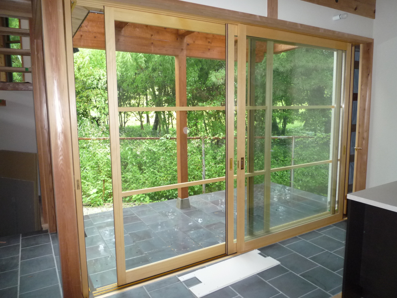 壁・床共にムク材を用いているため、年月と共に落ち着いた色合いへと、変化を楽しめる素敵なお家に仕上がりました。その中で建具の鮮やかな青が目を引くアクセントとなっています。